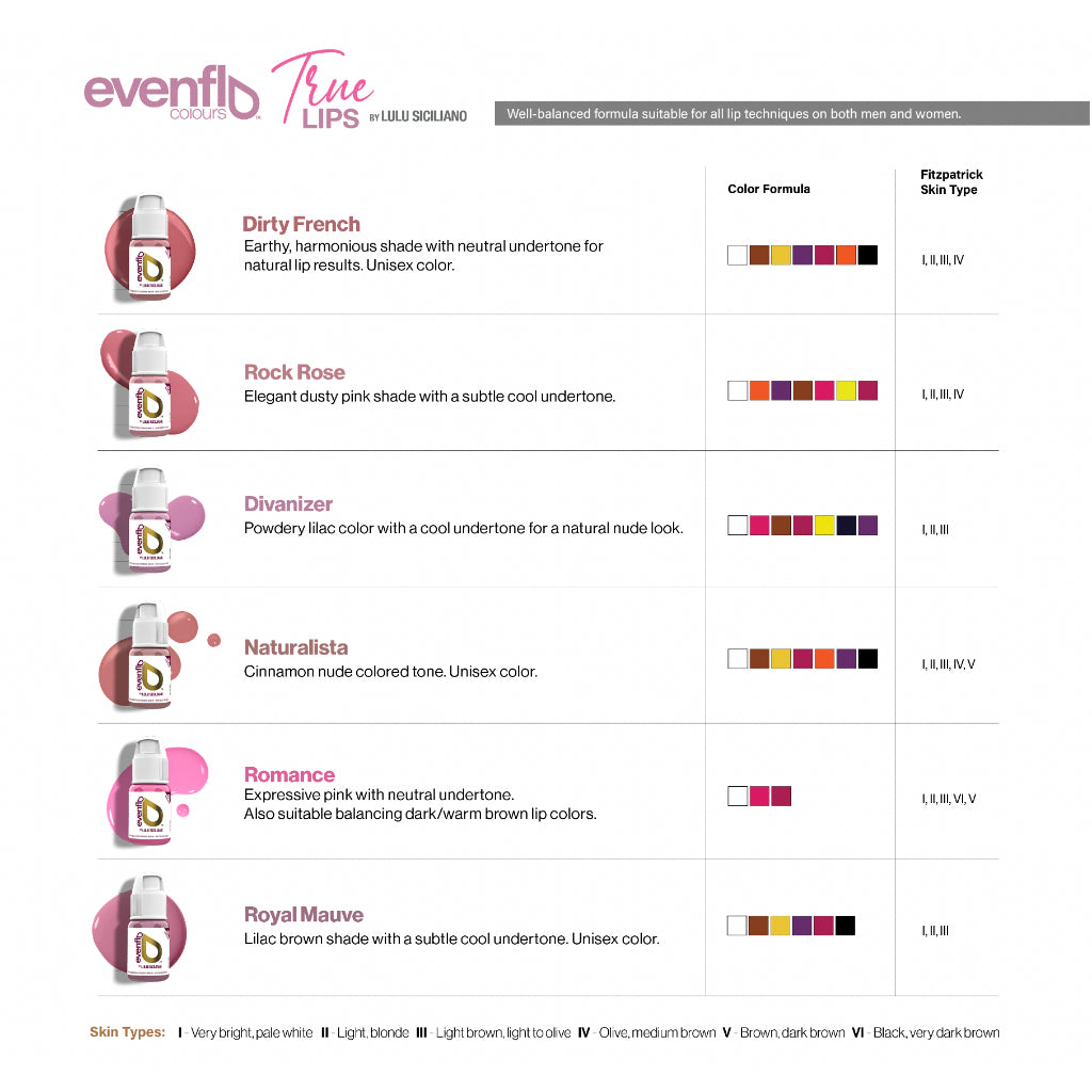 True Lips is an exciting pigment set for lips curated for you by Evenflo Colours founder and PMU expert Lulu Siciliano. Like many other Evenflo products, True Lips was manufactured with high-quality ingredients and proper safety standards to help you achieve optimal healed results every time. Now with trendy mauve and fabulously pink tones, this addition to the pigment collection is designed for Lip Blush or Lipstick techniques for both men and women. The balanced formula ensures a beautiful fading process in the long term. The Evenflo True Lips set, features 6 new colors ranging from deep, medium, and light pinks, to beautifully natural nude colors. The new, wide range of colors and EU REACH complaint formula allows artists to take on a whole new world of PMU.